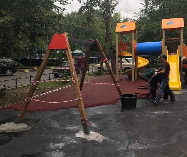 — На данном участке мы приводили в порядок основание для площадки, выполнили монтаж игрового оборудования, нанесли резиновое покрытие и отремонтировали газоны.